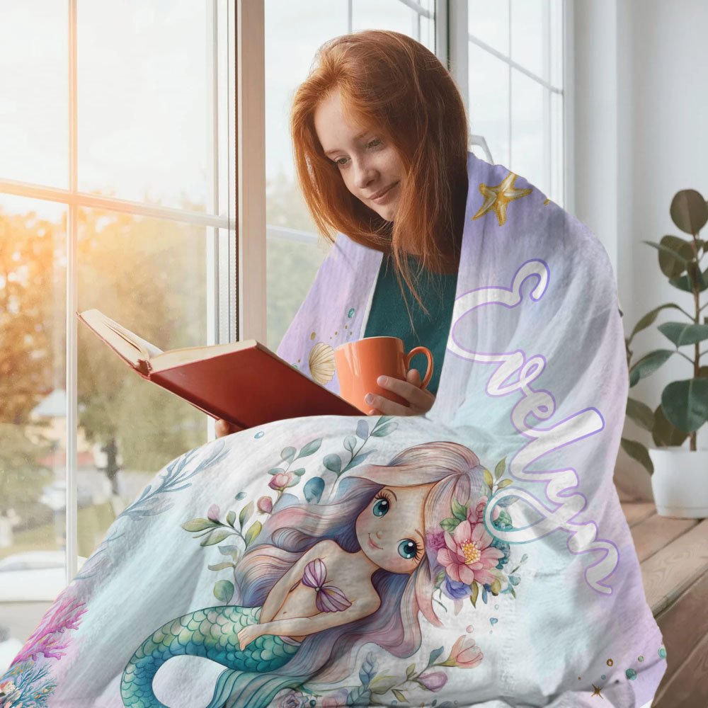 Personalized Fantasy Mermaid Princess Underwater World Soft Throw Blanket with Name Home Decor Birthday Gift for Girls